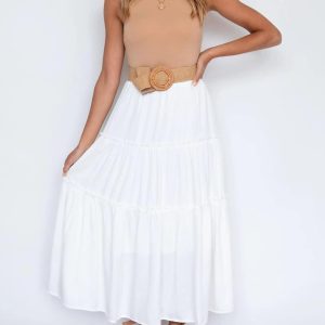 Women Flowy Boho Maxi Skirt Elastic High Waist A Line Pleated Tiered Summer Casual Beach Long Skirts with Pockets