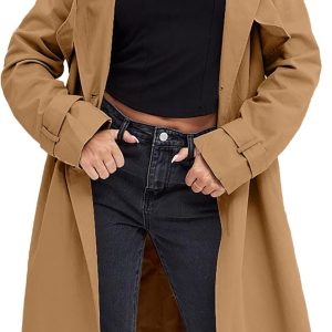 Women Double Breasted Trench Coats Causal Windproof Long Lapel Pocketed Overcoat with Belt