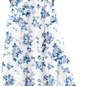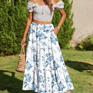 Skirts for Women Summer Boho Casual Maxi Flowy Elastic High Waist A-Line Tiered Swing Floral Long Skirts with Pockets